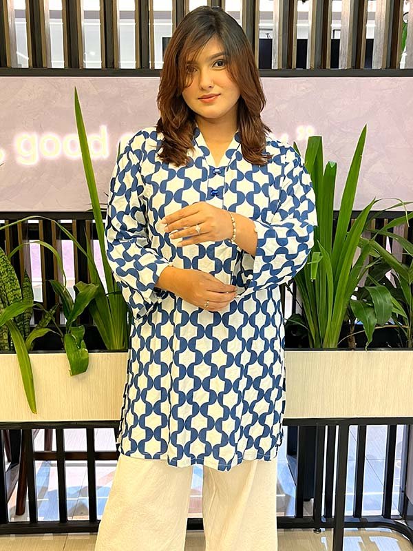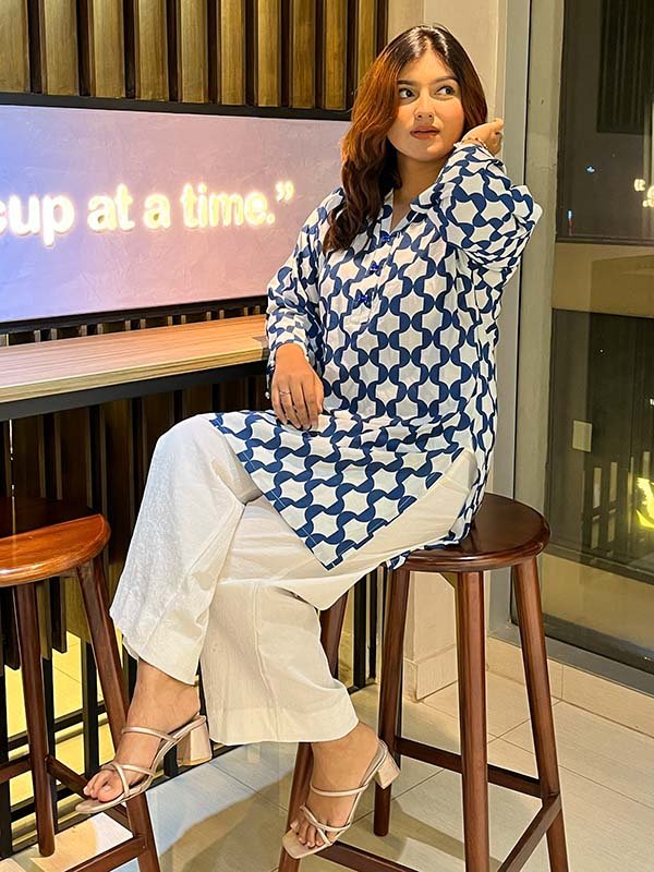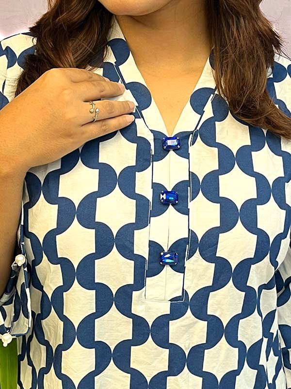 Navy Geometric Imported Silk-Georgette One-Piece Dress – stylish one-piece in premium imported silk and georgette mix fabric, showcasing intricate navy-white geometric prints.
