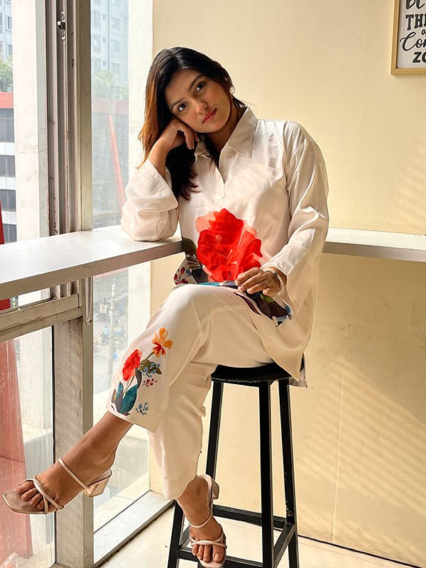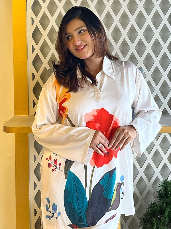 Vibrant Floral Shamu Silk Co-ord Set – this eye-catching coord set in premium Shamu Silk boasts bold floral prints in white base with red, green, and blue motifs.