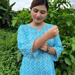 • Kameez Design: A long-line kameez showcasing a distinctive repeating pattern in contrasting shades of sky blue and white, creating a captivating visual texture.